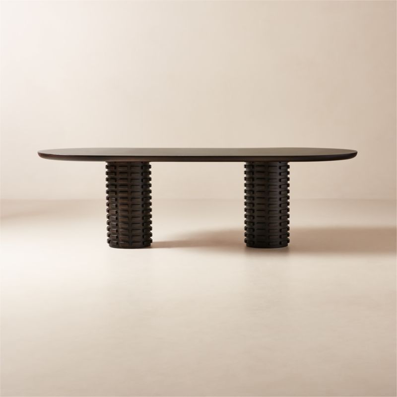 Designed by Sandra Githinji, mahogany oval dining table pairs traditional African architectural details with a modern silhouette. Born in Kenya and raised in Naarm (Melbourne), Australia, Sandra Githinji centers her designs on an African perspective. "Toron references the traditional architecture of the African peoples of the Sahel and Sudanian grassland regions. Facades are decorated with bundles of rodier palm sticks called 'toron' that project away from the wall as a type of scaffolding," explains the designer. Mahogany has been stained for a dark, powerful presence while still retaining its organic character, creating a one-of-a-kind piece with timeless appeal. CB2 exclusive.