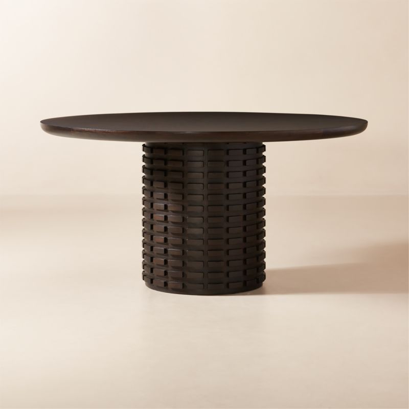 Designed by Sandra Githinji, mahogany round dining table pairs traditional African architectural details with a modern silhouette. Born in Kenya and raised in Naarm (Melbourne), Australia, Sandra Githinji centers her designs on an African perspective. "Toron references the traditional architecture of the African peoples of the Sahel and Sudanian grassland regions. Facades are decorated with bundles of rodier palm sticks called 'toron' that project away from the wall as a type of scaffolding," explains the designer. Mahogany has been stained for a dark, powerful presence while still retaining its organic character, creating a one-of-a-kind piece with timeless appeal. CB2 exclusive.