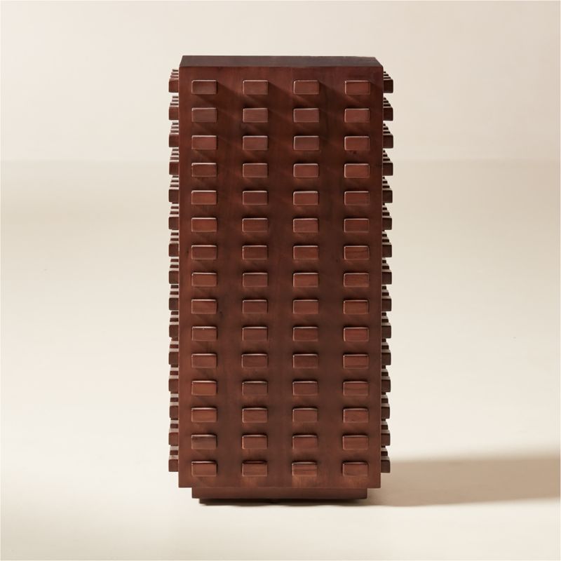 Designed by Sandra Githinji, acacia wood table pairs traditional African architectural details with a modern pedestal-style silhouette. Born in Kenya and raised in Naarm (Melbourne), Australia, Sandra Githinji centers her designs on an African perspective. "Toron references the traditional architecture of the African peoples of the Sahel and Sudanian grassland regions. Facades are decorated with bundles of rodier palm sticks called 'toron' that project away from the wall as a type of scaffolding," explains the designer. Acacia wood has been stained for a dark, powerful presence while still retaining its organic character, creating a one-of-a-kind piece with timeless appeal. CB2 exclusive.