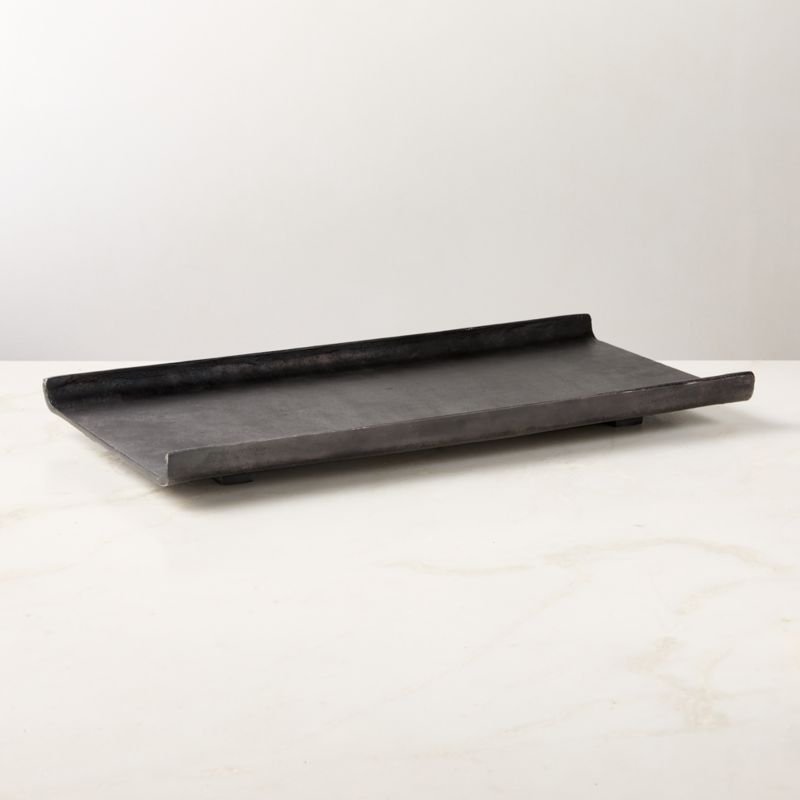 Rectangular cast metal tray adds a modern industrial look to the tablescape. Sand cast to achieve a textured surface, the piece is then metal-plated to achieve an antiqued patina. The rich blackened bronze finish will further develop a patina over time, giving the piece the one-of-a-kind look of a vintage find. CB2 exclusive.