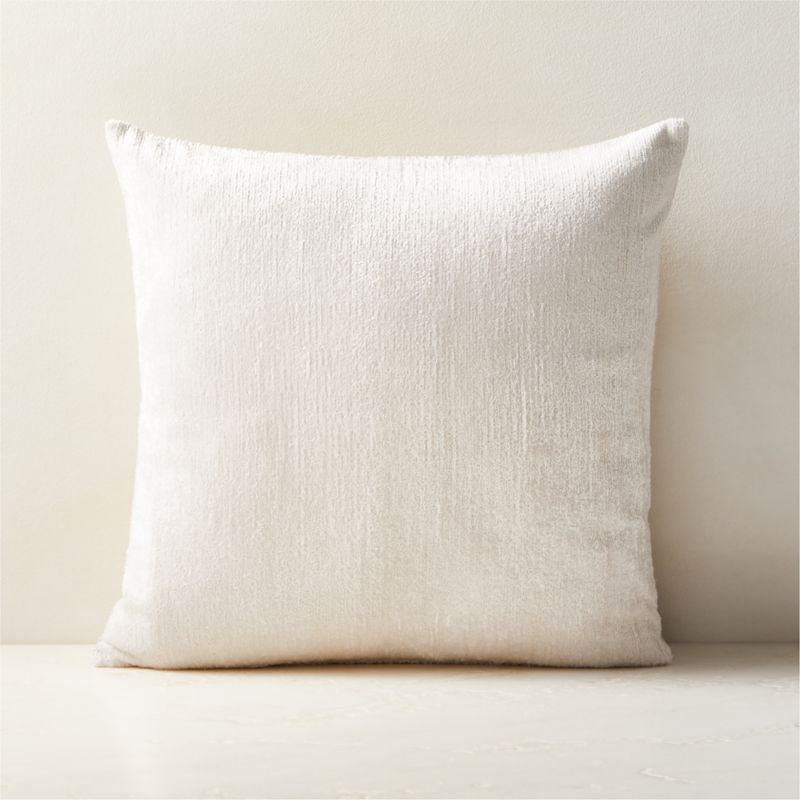 Authentic Turkish silk gives this throw pillow an elegant aesthetic and superior feel. Turkish silk threads are handloomed into an exceptionally rich, velvet-like texture to create a plush pillow. Because the silk is collected from different areas, there will be slight differences in color, as well as variations in the weave due to the handcrafted nature of the process. Natural variations in the nubs and slubs of the silk fiber draw attention to the fabric's beauty, highlighting its understated sheen. Knife edge with a hidden zipper closure, pillow flips to a solid neutral fine linen back. CB2 pillows include a pillow insert in your choice of feather-down or down alternative.