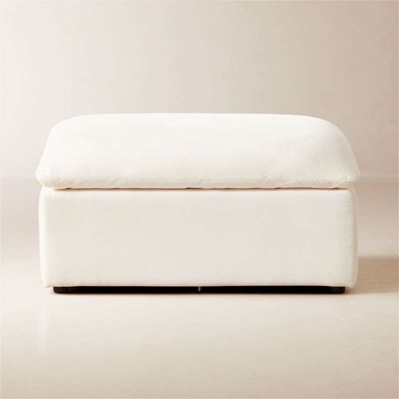 Kara Mann. "They've got this pillowed, effortless feel about them." Subtle curves and a single plush feather down cushion, covered in off-white Crypton performance velvet, make this ottoman the perfect lounging accessory. Its sturdy frame is made with poplar and eucalyptus certified sustainable by the Forest Stewardship Council ® (FSC). Pair with the armless chair and corner chair for a comfortable sectional tailored to your space. CB2 exclusive.