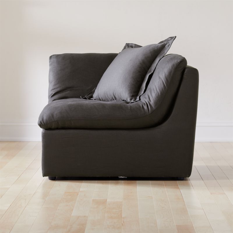 Kara Mann. "They've got this pillowed, effortless feel about them." Thanks to a single plush feather down cushion covered in luxe black sateen with a slub texture that keeps it from feeling too fussy. Subtle curve makes this corner chair perfect for lounging. Pair with the armless chair and ottomon for a comfy situation tailored to your space. CB2 exclusive.