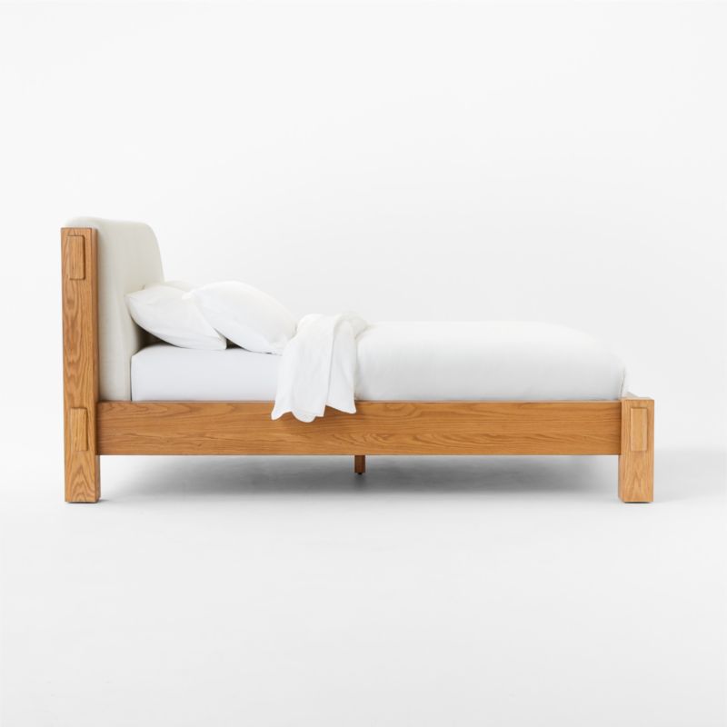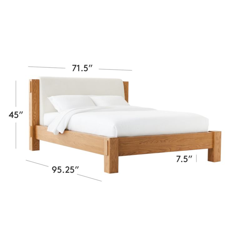 VUUE is designed to define the primary bedroom. Crafted from American white oak certified sustainable by the Forest Stewardship Council ® (FSC), the bed is marked by exposed joinery on the corners of the head- and footboard. Ivory linen upholstery cushions the headboard for bedtime lounging. CB2 exclusive.