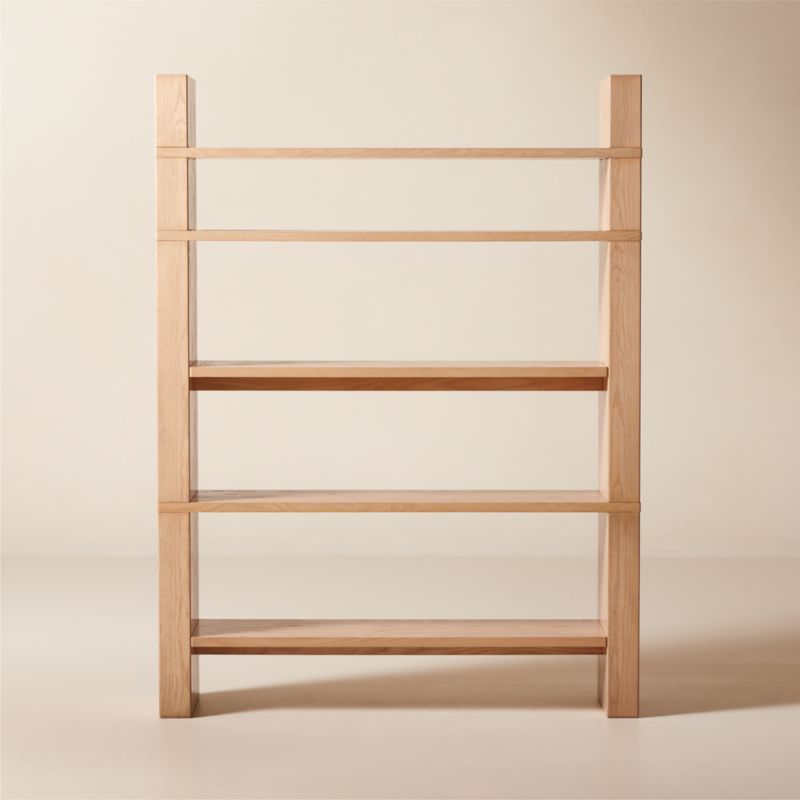 Tall wooden bookcase by Brett Beldock has an airy feel due to open shelves and a light natural finish. Ash wood, certified sustainable by the Forest Stewardship Council ® (FSC), showcases the natural beauty of the wood grain. Perfectly proportioned for the living room, office or bedroom, minimalist bookcase has five fixed shelves that sport joinery details at their connection points. CB2 exclusive.