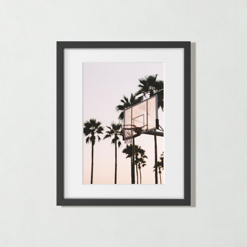 A basketball hoop set against the backdrop of Venice Beach's palm trees. Taken by Raf Maes in July 2016. Part of CB2's collaboration with Sonic Editions, the image is printed and expertly mounted in a handcrafted wood frame.