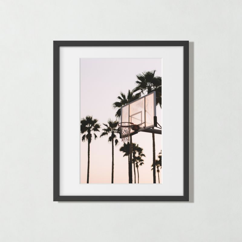 A basketball hoop set against the backdrop of Venice Beach's palm trees. Taken by Raf Maes in July 2016. Part of CB2's collaboration with Sonic Editions, the image is printed and expertly mounted in a handcrafted wood frame.