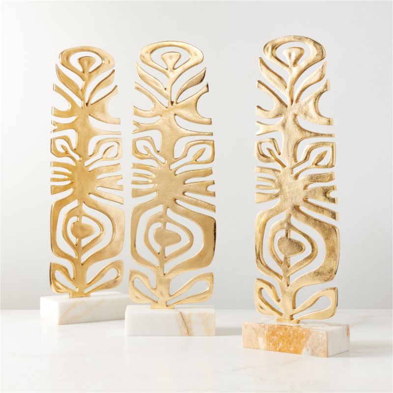Polished cast brass sculpture pays homage to the distinctive motifs of California midcentury modernism. Recreated from "Flowers," an original 1964 hand-hooked wall hanging by Los Angeles artist Evelyn Ackerman, the freestanding sculpture, set on a solid Italian marble base, captures the expressiveness of pattern and composition. The original motif, now translated in polished cast brass for modern audiences, highlights Ackerman's rare ability to design across a wide range of materials. Brass is unlacquered, offering a living finish that will develop the patina of a vintage find. CB2 exclusive.