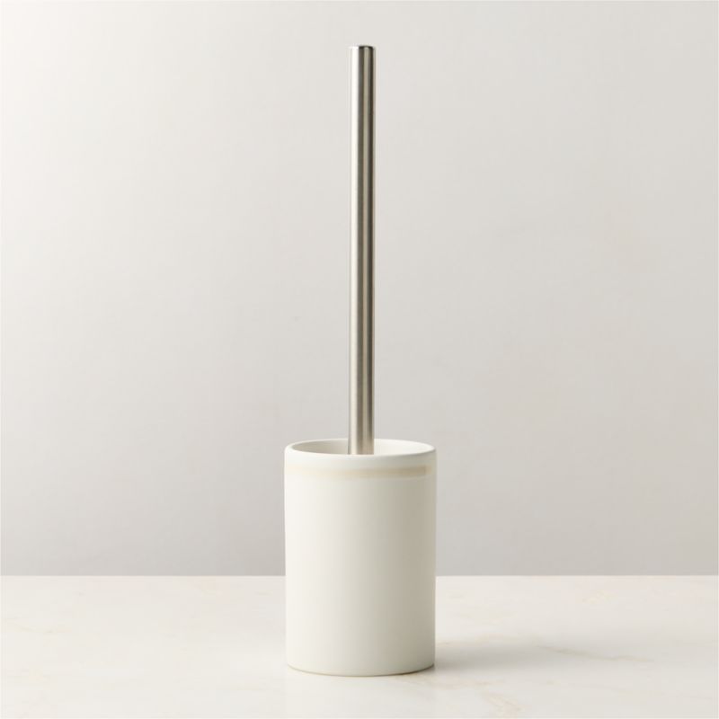 Crafted with rounded edges and a distinctive matte ivory glaze, ceramic toilet brush is topped with a contrasting brushed nickel handle. High-gloss glazed details are applied by skilled artisans in Portugal for a sophisticated look with ease. Pair with the other Violeta bath accessories for a coordinated look. CB2 exclusive.