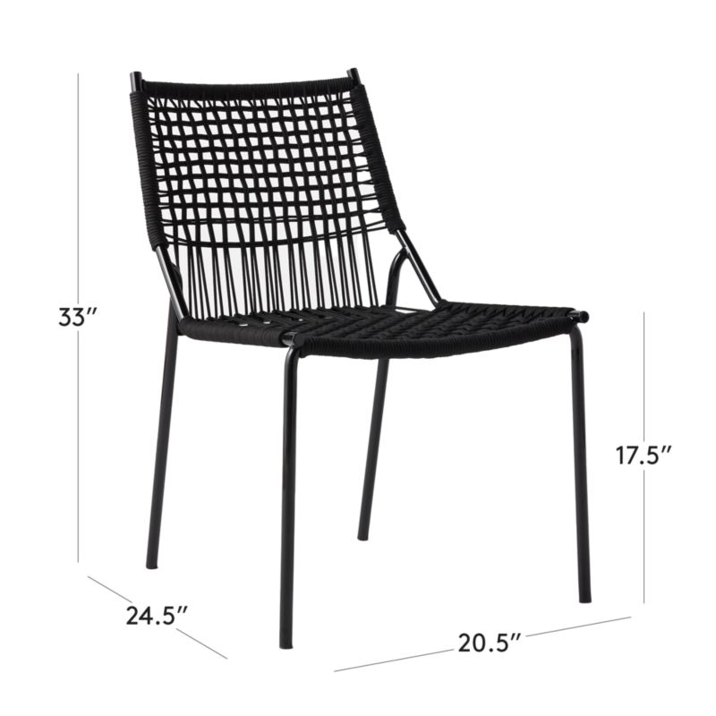 Black rope wraps around the polished frame of this modern outdoor dining chair designed by Jannis Ellenberger. Sporting a compact profile, the breezy woven design is great for small spaces. Chairs stack for convenient storage. CB2 exclusive.