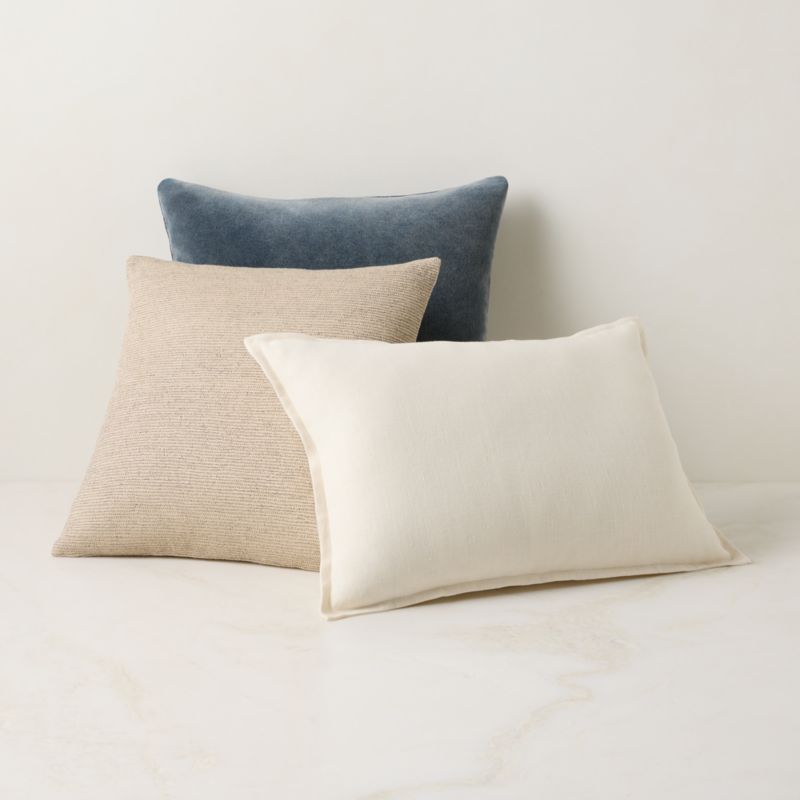 Pillow cover set brings together three distinct textiles that celebrate craftsmanship, texture and the beauty of natural variation. Hand-embroidered cotton, délavé garment-dyed flax linen and stone-washed velvet create a layered composition of softness and depth. Together, they present a collected, easy elegance. CB2 pillows include a pillow insert in your choice of feather down or down alternative. CB2 exclusive.