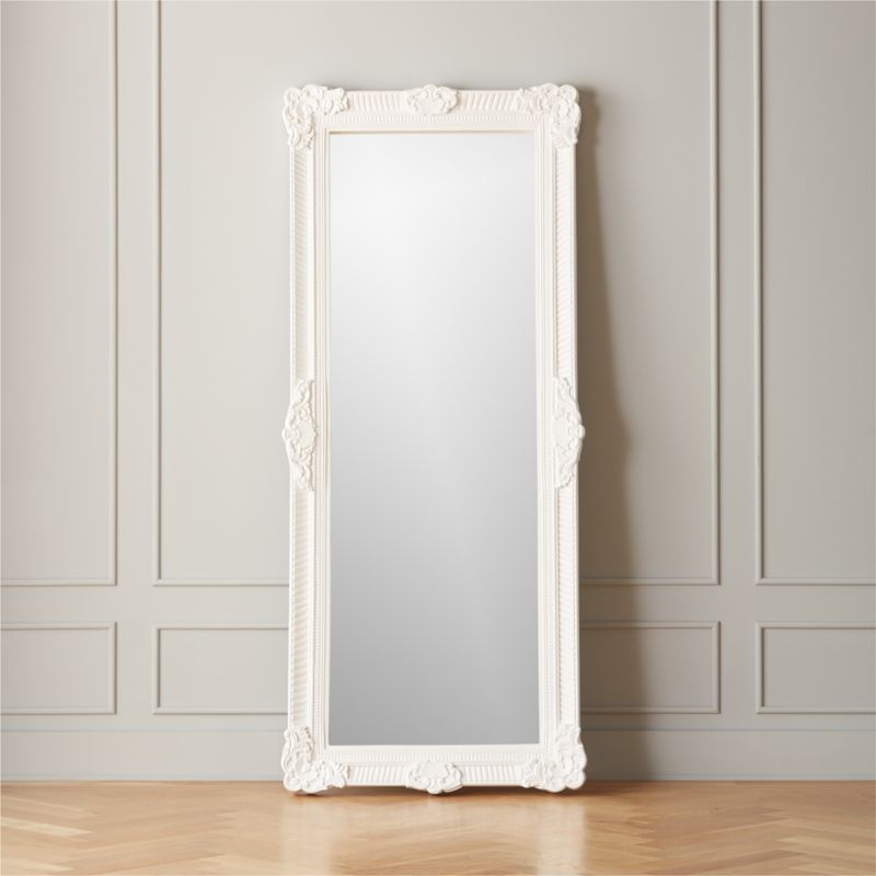Ornate Baroque-style frame is hand-carved from mango wood. Finished matte white, full length mirror brings a vintage aesthetic to any space. Leans beautifully on the bedroom, living room or entry wall. Anti-tip hardware is included to keep it secure. CB2 exclusive.