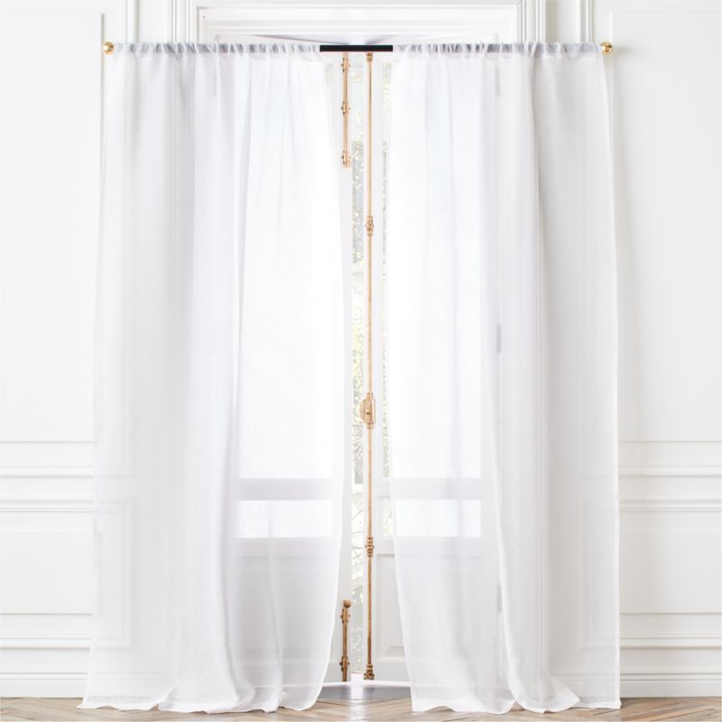 Sheer white linen instantly lightens up any space. Airy curtain panel drapes beautifully alone or layers in lovely contrast with heavier panels. CB2 exclusive.