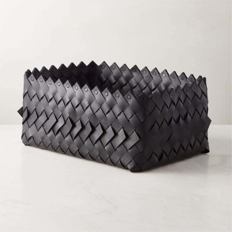 Straps of black leather are woven into a crosshatch pattern with black grommets around the rim for a monochromatic accent. Woven basket stores larger items neatly, such as wood logs near the fireplace. CB2 exclusive.