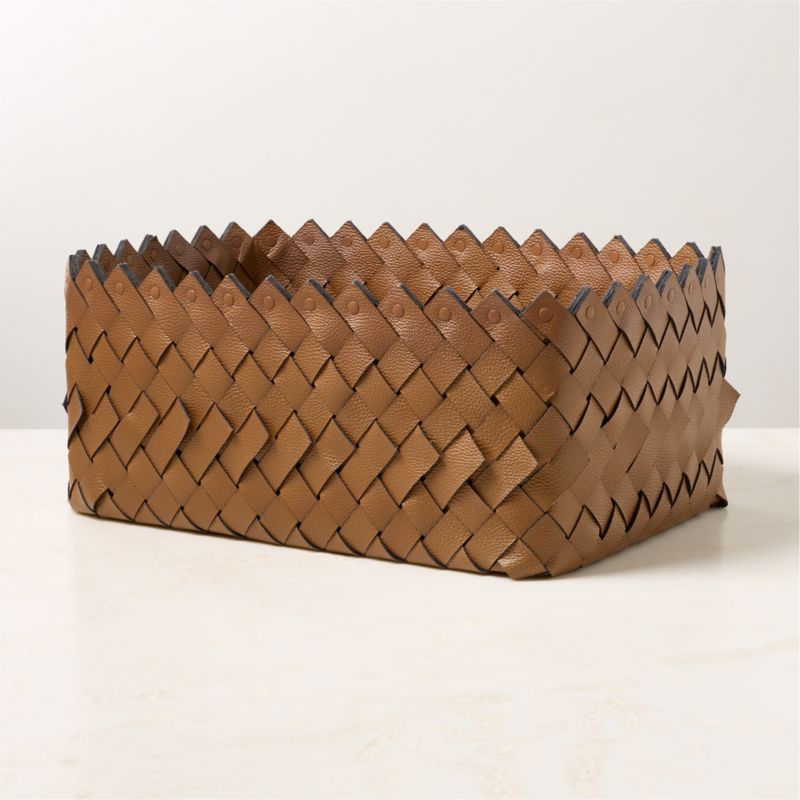 Handwoven pebbled leather basket offers a refined take on storage. Thick woven strips of high-quality dyed leather create a soft-sided yet structured storage solution. CB2 exclusive.