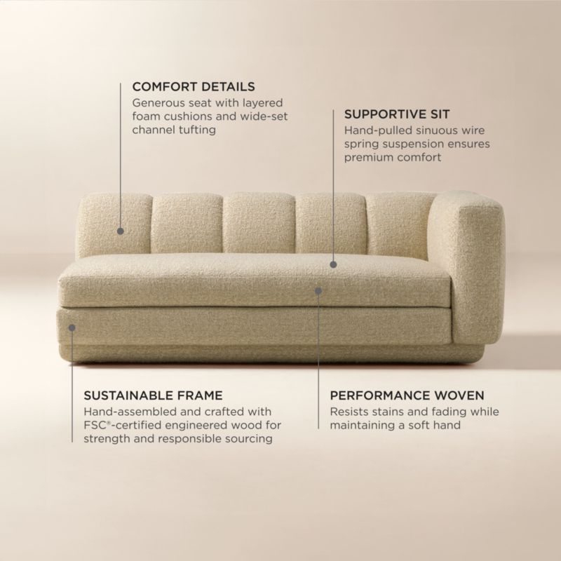 Lawson-Fenning has generous proportions for gathering and relaxing. A deep seat is complemented by a relaxed back with wide-set channel tufting that highlights the rich texture of the easy-care textured woven performance upholstery. Each piece is assembled by hand to ensure a level of quality befitting the design. Coordinates with other pieces from the Yarrow collection to create a sectional sofa. CB2 exclusive.