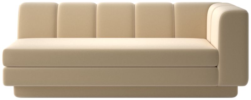 Taking stylistic nods from 1970s Italian design and the designers' own laid-back Southern California aesthetic, right-arm sofa by Lawson-Fenning has generous proportions for gathering and relaxing. A deep seat is complemented by a relaxed back with wide-set channel tufting. Each piece is assembled by hand to ensure a level of quality befitting the design. Coordinates with other pieces from the Yarrow collection to create a sectional sofa. CB2 exclusive.